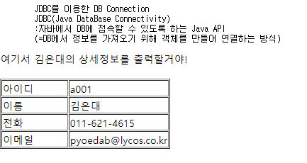 <%@page import="java.util.Map"%> <%@page import="kr.or.ddit.Service"%> <%@ page language="java" contentType="text/html; charset=UTF-8" pageEncoding="UTF-8"%> <!DOCTYPE html> <html> <head> <meta charset="UTF-8"> <title>Insert title here</title> <style> td{ width: 100px; } </style> </head> <body> <pre> JDBC를 이용한 DB Connection JDBC(Java DataBase Connectivity) :자바에서 DB에 접속할 수 있도록 하는 Java API (=DB에서 정보를 가져오기 위해 객체를 만들어 연결하는 방식) </pre> <% //상세 정보를 가져오기 위한 요청데이터로 활용 String nm = request.getParameter("name"); /*처리 과정 - service객체를 얻어와 메소드를 호출하고 결과 값을 전달 받음 1. Service에서 Dao호출 2. Dao에서 spl조회 3. Dao에서 Service로 값을 반환 4. Service에서 jsp로 값을 전달 */ Service service = Service.getInstance(); Map<String, Object> map = service.selectMemberOne(nm); String userId = (String)map.get("id"); String userHp= (String)map.get("hp"); String userMail= (String)map.get("ml"); %> 여기서 <%=nm %>의 상세정보를 출력할거야! <br><br> <table border="1"> <tr> <td>아이디</td><td><%=userId %></td> </tr> <tr> <td>이름</td><td><%=nm %></td> </tr> <tr> <td>전화</td><td><%=userHp %></td> </tr> <tr> <td>이메일</td><td><%=userMail%></td> </tr> </table> </body> </html>