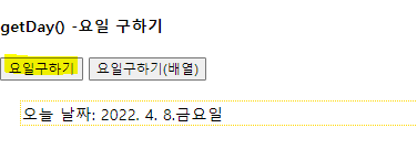 <!DOCTYPE html> <html> <head> <meta charset="UTF-8"> <title>Insert title here</title> <link rel="stylesheet" href="../css/outStyle.css"> <style> div{ border: 2px dotted gold; margin: 20px; } </style> </head> <body> <h4>getDay() -요일 구하기</h4> <input type="button" value="요일구하기" onclick="proc1()"> <input type="button" value="요일구하기(배열)" onclick="proc2()"> <div></div> <script> var today = new Date(); //전역 function proc1(){ var result = `오늘 날짜: ${today.toLocaleDateString()}`; //요일 구하기 var day = today.getDay(); alert(day); switch (day) { case 0: result += `일요일`; break; case 1: result += `월요일`; break; case 2: result += `화요일`; break; case 3: result += `수요일`; break; case 4: result += `목요일`; break; case 5: result += `금요일`; break; case 6: result += `토요일`; break; } document.getElementsByTagName('div')[0].textContent =result; } function proc2(){ var days =["일","월","화","수","목","금","토"]; //요일 구하기 var day = today.getDay(); document.getElementsByTagName('div')[0].textContent = `${days[day]}요일입니다.`; } </script> </body> </html>