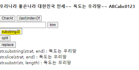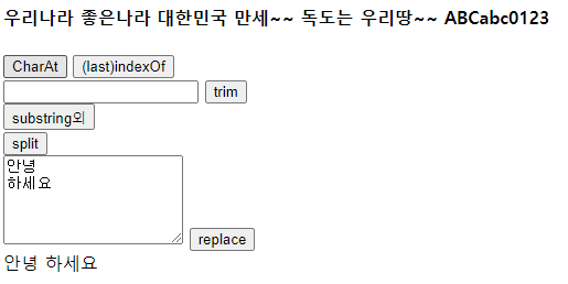 <!DOCTYPE html> <html> <head> <meta charset="UTF-8"> <title>Insert title here</title> <link rel="stylesheet" href="../css/outStyle.css"> </head> <body> <h4>우리나라 좋은나라 대한민국 만세~~ 독도는 우리땅~~ ABCabc0123</h4> <input type="button" value="CharAt" onclick="fn1()"> <input type="button" value="(last)indexOf" onclick="fn2()"> <br> <input id="txt"> <input type="button" value="trim" onclick="fn3()"> <br> <input type="button" value="substring외" onclick="fn4()"> <br> <input type="button" value="split" onclick="fn5()"> <br> <textarea rows="5" cols="20"></textarea> <input type="button" value="replace" onclick="fn6()"> <div></div><script > var str ="우리나라 좋은나라 대한민국 만세~~ 독도는 우리땅~~ABCabc0123"; 따로 밑에 구현 function fn1() function fn2() function fn3() function fn4() </script> </body> </html>function fn1(){ //charAt(idx) :index 번째의 문자 반환 //charCodeAt(idx) : index번째 문자의 유니코드를 반환 var result =`str.charAt(3) : ${str.charAt(3)} <br>`; result +=`str.charCodeAt(3) : ${str.charCodeAt(3)} <br>`; document.getElementsByTagName('div')[0].innerHTML =result; }