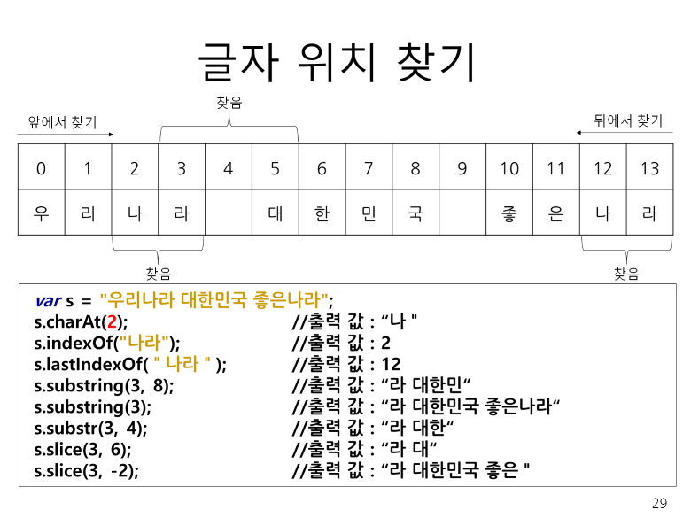 function fn2(){ //ondexOf(value , 검색이 시작될 지점), lastIndexOf(value, 검색을 끝낼 지점) var result = `str.indexOf("우리",4) : ${str.indexOf('우리',4)} <br>`; result += `str.lastIndexOf("우리",20) : ${str.lastIndexOf('우리',20)} <br>`; result += `str.indexOf("붹") : ${str.indexOf("붹")} <br>`; document.getElementsByTagName('div')[0].innerHTML =result; }