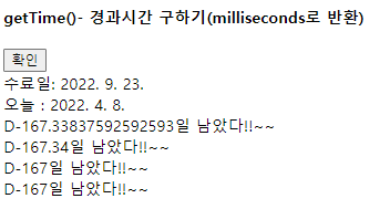 <!DOCTYPE html> <html> <head> <meta charset="UTF-8"> <title>Insert title here</title> <link rel="stylesheet" href="../css/outStyle.css"> </head> <body> <h4>getTime()- 경과시간 구하기(milliseconds로 반환)</h4> <input type="button" value="확인" onclick="proc()"> <div></div> <script> var now = new Date(); var proc = function(){ var complet = new Date("2022.09.23"); //getTime()으로 현재 날짜와 대상 날짜의 miliiseconds 구하기 var today = now.getTime(); var comp = complet.getTime(); var ms= comp - today; var day =ms/1000/60/60/24; //출력문장 완성 var result=`수료일: ${complet.toLocaleDateString()} <br>`; result += `오늘 : ${now.toLocaleDateString()} <br>`; result += `D-${day}일 남았다!!~~ <br>`; result += `D-${day.toFixed(2)}일 남았다!!~~ <br>`; //반올림 result += `D-${Math.round(day)}일 남았다!!~~ <br>`; //올림 result += `D-${Math.floor(day)}일 남았다!!~~ <br>`; //내림 document.getElementsByTagName('div')[0].innerHTML =result; } </script> </body> </html>