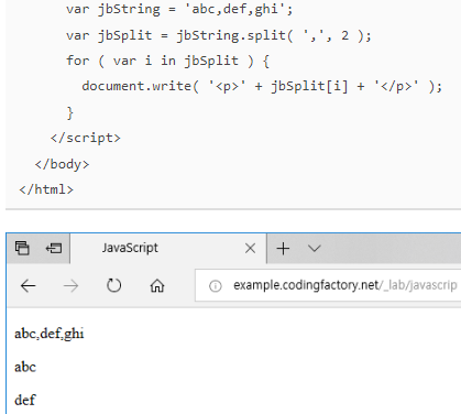 function fn5(){ //split(구분자, 구분갯수) : 구분자를 기준으로 문자열을 분리하여 배열로 반환 // 구분갯수 지정 값은 포함되지 않음(추청) var result = "문자열 일 때 : str[3] "+str[3]+"<br>"; var arr = str.split(" "); result +=` 배열로 반환 후: arr[3] : ${arr[3]}`; document.getElementsByTagName('div')[0].innerHTML =result; }