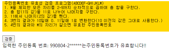 <!DOCTYPE html> <html> <head> <meta charset="UTF-8"> <title>Insert title here</title> <link rel="stylesheet" href="../css/outStyle.css"> </head> <body> <pre> 주민등록번호 유효성 검증 프로그램(ABCDEF-GHIJKLM) 1. M을 제외한 모든 자리를 2-9까지 순차적으로 곱하여 총 합을 구한다. 2. 총 합(1의 값)을 11로 나누어 나머지를 구한다. 3. 11에서 나머지(2의 값)를 뺀다. 4. 3번의 결과가 10일때 0. 11일때 1로 변환한다(10 이전의 값은 그대로 사용한다.) 5. 4번의 결과와 M의 자리가 같으면 유효한 주민등록번호 </pre> <input type="button" value="검증" onclick="fn2()"> <div id="d2"></div> <script> function fn2() { var a = prompt("주민등록번호를 입력하세요","110325-4478995"); var num = a.replace("-",""); // 1. M을 제외한 모든 자리를 2~9까지 순차적으로 곱하여 총 합을 구한다. // num >> (ABCDEFGHIJKLM*) >> (1103254478995*) // * 234567892345 var hap = 0; var str = "234567892345"; for(var i=0; i<num.length-1; i++){ //M을 제외한 나머지 if(num.charAt(i) == '0') continue; //방법1 hap += num.charAt(i) * (i%8+2) //i를 8로 나눈값에 2 더하기 ex)0%8+2=2, 1%8+2=3, ..., 7%8+2=9, 8%8+2=2 //방법2 //hap += num.charAt(i) * str[i]; } // 2. 총 합(1의 값)을 11로 나누어 나머지를 구한다. // 3. 11에서 나머지(2의 값)을 뺀다. var rst = 11-(hap%11); // 4. 3번의 결과가 10일때 0, 11일때 1로 변환한다(10 이전의 값은 그대로 사용한다) // alert(rst); rst = rst%10; // 5. 4번의 결과와 M의 자리가 같으면 유효한 주민등록번호 var last = a.charAt(num.length); //M의 값 var result = ``; if(rst==last) result += `주민등록번호가 유효합니다!!`; else result += `주민등록번호가 유효하지않습니다`; //출력 var print = `입력한 주민등록번호: ${a.substring(0,8)}******`; print += `는 ${result}`; document.getElementById('d2').innerHTML = print; } </script> </body> </html>
