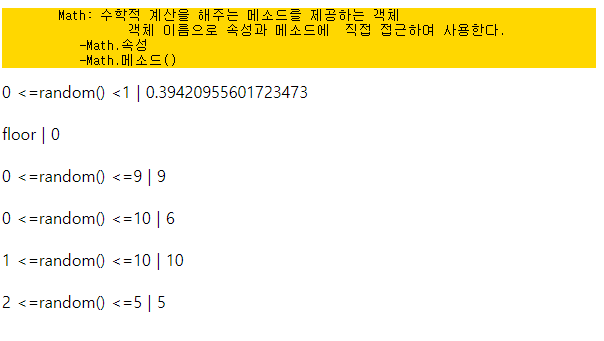 <!DOCTYPE html> <html> <head> <meta charset="UTF-8"> <title>Insert title here</title> <link rel="stylesheet" href="../css/outStyle.css"> </head> <body> <script> /*random() : *난수를 발생시키는 메소드 0~1미만(1은 포함하지 않음)구간에서 부동소수점의 난수 생성 *난수 : 정의된 범위 내 무작위로 추출된 수 */ // 0 <=random() <1 document.write("0 <=random() <1 | " + Math.random() + "<br><br>"); // floor()이용해서 소수점 이하 버림 document.write("floor | " + Math.floor(Math.random()) + "<br><br>"); // 0<=random() <=9 document.write("0 <=random() <=9 | " +Math.floor(Math.random()*10) + "<br><br>"); // 0<=random() <=10 document.write("0 <=random() <=10 | " +Math.floor(Math.random()*11) + "<br><br>"); // 1<=random() <=10 document.write("1 <=random() <=10 | " +Math.floor(Math.random()*10+1) + "<br><br>"); //2<=random() <=5 document.write("2 <=random() <=5 | " +Math.floor(Math.random()*4+2) + "<br>"); </script> </body> </html>