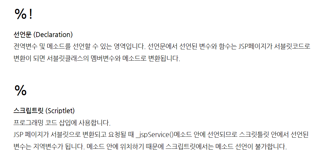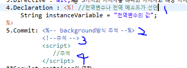 -전역변수 및 메소드를 선언할 수 있는 영역이며 선언된 변수와 함수는 JSP페이지가 서블릿코드로 변환이 되면 서블릿 클래스의 멤버변수와 메소드로 변환됩니다.