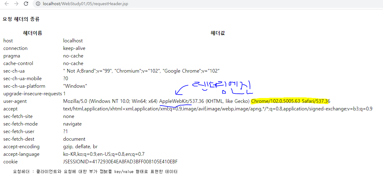 <%@page import="java.util.Enumeration"%> <%@ page language="java" contentType="text/html; charset=UTF-8" pageEncoding="UTF-8"%> <!DOCTYPE html> <html> <head> <meta charset="UTF-8"> <title>05/requestHeader.jsp</title> </head> <body> <h4>요청 헤더의 종류</h4> <table> <thead> <tr> <th>헤더이름</th> <th>헤더값</th> </tr> </thead> <tobody> <% String pattern ="<tr><td>%s</td><td>%s</td></tr>"; Enumeration<String> headerNames=request.getHeaderNames(); while(headerNames.hasMoreElements()){ String name =headerNames.nextElement(); String value = request.getHeader(name); out.println(String.format(pattern, name, value)); } %> </tobody> </table> <pre> 요청헤더 : 클라이언트와 요청에 대한 부가 정보를 key/value 형태로 표현한 데이터 </pre> </body> </html>