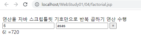 <%@page import="java.util.Objects"%> <%@ page language="java" contentType="text/html; charset=UTF-8" pageEncoding="UTF-8"%> <!DOCTYPE html> <html> <head> <meta charset="UTF-8"> <title>04/factorial.jsp</title> <script type="text/javascript" src="<%=request.getContextPath()%>/resources/js/jquery-3.6.0.min.js"></script> </head> <body> <h4></h4> <!-- 1.Model -> Model2 ->ajax -> XML/JSON(Marshalling) --> <!-- 2! ->2*1 =2, 3! ->3*2*1 =6 --> 연산을 자바 스크립틀릿 기호만으로 반복 곱하기 연산 수행 <br> <!-- <form action="명령어_요청URL" method="파라미터 전송 방법 & 요청의 목적" enctype="요청 데이터의 표현 방식"></form> --> <form action="<%=request.getContextPath()%>/04/factorial.do" name="facForm" method="get"> <input type="number" name="number" min="0" value="" /> <input type="text" name="dummy" value="asas"/> <input type="submit" value="="/> </form> <div id ="resultArea"> </div> <script> //발생한 이벤트는 파라미터로 들어오며, 이벤트에는 그 이벤트를 발생시킨 타켓이 들어가 있다. let resultArea =$("#resultArea"); //변수로 받아놓는게 좋음 let facForm = $("form[name]").on("submit",function(event){ event.preventDefault(); //form 의 submit 이벤트의 기본 특성은 동기 요청. console.log(event.target); console.log(this); // $(this) -> httpelement 에서 JQuery객체화 // XMLHttpRequest 객체를 활용한 비동기 요청 let action =this.action; //$(this).attr("action"); let method = this.method; let data =$(this).serialize(); //Query String 생성 console.log(data); //ex)parm1=value¶m2=value2 $.ajax({ url: action, method:method, data:data, dataType:"json" //text, html, json, xml, script->main type :text, 파일업로드 처리를 비동기로? (FormData) ,success:function(resp,status,jqXHR){ //resp : html소스 옴 //$("#resultArea").html(resp); //resultArea.html(JSON.stringfy(resp)); $("#resultArea").html(resp); //alert(resp.test); }, error :function(jqXHR, status, error){ console.log(jqXHR) console.log(status) console.log(error) } }); return false; }); console.log(facForm); </script> </body> </html>