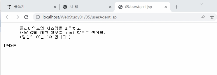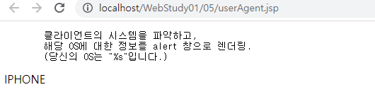 <%@page import="java.util.Enumeration"%> <%@ page language="java" contentType="text/html; charset=UTF-8" pageEncoding="UTF-8"%> <!DOCTYPE html> <html> <head> <meta charset="UTF-8"> <title>05/userAgent.jsp</title> </head> <body> <pre> 클라이언트의 시스템을 파악하고, 해당 OS에 대한 정보를 alert 창으로 렌더링. (당신의 OS는 "%s"입니다.) </pre> <% String pattern ="당신의 OS는 \"%s\"입니다."; String agent = request.getHeader("User-Agent"); agent = agent.toUpperCase(); String osName =null; if(agent.contains("WINDOWS")){ osName ="윈도우"; }else if(agent.contains("ANDROID")){ osName ="안드로이드"; }else if(agent.contains("IPHONE")){ osName ="아이폰"; }else{ osName ="식별불가OS"; } String message=String.format(pattern,osName); %> <script> alert('<%=message%>'); </script> </body> </html>