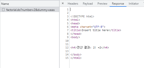 package kr.or.ddit.servlet04; import java.io.IOException; import java.io.PrintWriter; import java.util.HashMap; import java.util.Map; import java.util.Map.Entry; import javax.servlet.ServletException; import javax.servlet.annotation.WebServlet; import javax.servlet.http.HttpServlet; import javax.servlet.http.HttpServletRequest; import javax.servlet.http.HttpServletResponse; @WebServlet("/04/factorial.do") public class FactorialServlet extends HttpServlet{ @Override protected void doGet(HttpServletRequest req, HttpServletResponse resp) throws ServletException, IOException { String accept =req.getHeader("Accept"); (추가!) //클라이언트 보내는 모든 데이터는 검증이 필요함!!!! String param = req.getParameter("number"); if(param!=null && param.matches("\\d+")){ String pattern ="%d! =%d"; int number =Integer.parseInt(param); //재귀 호출 long result= factorial(number); String expression = String.format(pattern, number, result); Map<String, Object> resultMap = new HashMap<>(); resultMap.put("expression",expression); resultMap.put("result",result); (추가!) if(accept.contains("json")) { //응답 데이터를 json으로 표현 방식 변경. -Marshalling(native 언어로 표현된 데이터를 범용 표현 방식의 언어로 바꾸는 과정) //JSON(JavaScript Object Notation) JSON을 객체화해야함 //{"expresssion":123123} 즉 {"expresssion":"6!=720"} StringBuffer json = new StringBuffer(); json.append("{"); for(Entry<String, Object> entry : resultMap.entrySet()/*맵을 셋으로 바꿈*/) { String key = entry.getKey(); Object value = entry.getValue(); if("expression".equals(key)) { json.append("\"" + key.toString() + "\" : \"" + value.toString() + "\""); } } json.append("}"); PrintWriter out =resp.getWriter(); out.println(json); }else { // request(Map존재) scope사용 req.setAttribute("expression", expression); //서버사이드 방식임 그래서 /WebStudy01없어야함 String view ="/WEB-INF/views/FactorialView.jsp"; req.getRequestDispatcher(view).forward(req, resp); } }else if(param!=null && !param.matches("\\d+")){ //클라이언트에게 잘못됐다는것을 에러메세지 resp.sendError(HttpServletResponse.SC_BAD_REQUEST, "펙토리얼 연산은 양수와 숫자만으로 처리"); return; } } public long factorial(int number) { if(number<0) throw new IllegalArgumentException("음수에 대해서는 연산 불가"); if(number ==0){ return 1; }else{ return number*factorial(number-1); } } }