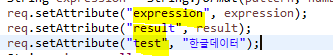 package kr.or.ddit.commons; import java.io.IOException; import java.io.PrintWriter; import java.util.Enumeration; import javax.servlet.ServletException; import javax.servlet.annotation.WebServlet; import javax.servlet.http.HttpServlet; import javax.servlet.http.HttpServletRequest; import javax.servlet.http.HttpServletResponse; @WebServlet("/jsonView.do") public class JsonMarshallingViewServlet extends HttpServlet{ @Override protected void doGet(HttpServletRequest req, HttpServletResponse resp) throws ServletException, IOException { resp.setContentType("application/json;charset=UTF-8"); // 응답데이터를 json 으로 표현 방식 변경. - Marshalling(native 언어로 표현된 데이터를 범용 표현 방식의 언어로 바꾸는 과정) // JSON(JavaScript Object Notation) // {"expression":123123} {"expression": "6! = 720" , } StringBuffer json = new StringBuffer(); String jsonPtrn = "\"%s\":\"%s\" , "; json.append("{"); Enumeration<String> attrNames = req.getAttributeNames(); //여러개의 속성이름들가져옴 while (attrNames.hasMoreElements()) { attrNames="expression" ,"result" 이렇게 이름만!! String key = (String) attrNames.nextElement(); Object value = req.getAttribute(key); //여기서 꺼낼 수 있는 이유는 set으로 담아왔기 때문 json.append(String.format(jsonPtrn, key, value)); } int lastIndex = json.lastIndexOf(","); if(lastIndex >= 0 ) { //0보다 크면 ,가 있다. 해당안되면-1나옴 json.deleteCharAt(lastIndex); } json.append("}"); PrintWriter out = resp.getWriter(); out.println(json); // Serialize : 데이터를 전송 혹은 저장하기 위해 바이트 배열의 형태로 변환하는 작업. } }Enumeration<String> attrNames = req.getAttributeNames();