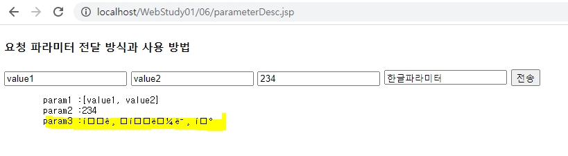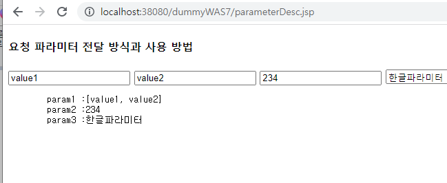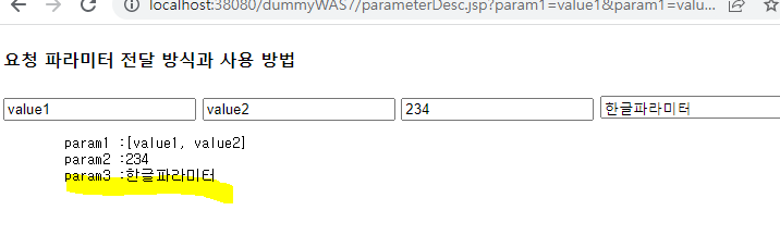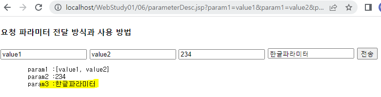 <%@page import="java.util.Map"%> <%@page import="java.util.Arrays"%> <%@ page language="java" contentType="text/html; charset=UTF-8" pageEncoding="UTF-8"%> <!DOCTYPE html> <html> <head> <meta charset="UTF-8"> <title>06/parameterDesc.jsp</title> </head> <body> <h4>요청 파라미터 전달 방식과 사용 방법</h4> <form method="post" > <input type="text" name="param1" value="value1"/> <input type="text" name="param1" value="value2"/> <input type="number" name="param2" value="234"/> <input type="text" name="param3" value="한글파라미터"/> <input type="submit" value="전송"/> </form> <% Map<String,String[]> parameyerMap = request.getParameterMap(); if(parameyerMap.size()>0){ %> <pre> param1 :<%=Arrays.toString(request.getParameterValues("param1")) %> param2 :<%=Integer.parseInt(request.getParameter("param2"))%> param3 :<%=request.getParameter("param3") %> </pre> <% } %> </body> </html>