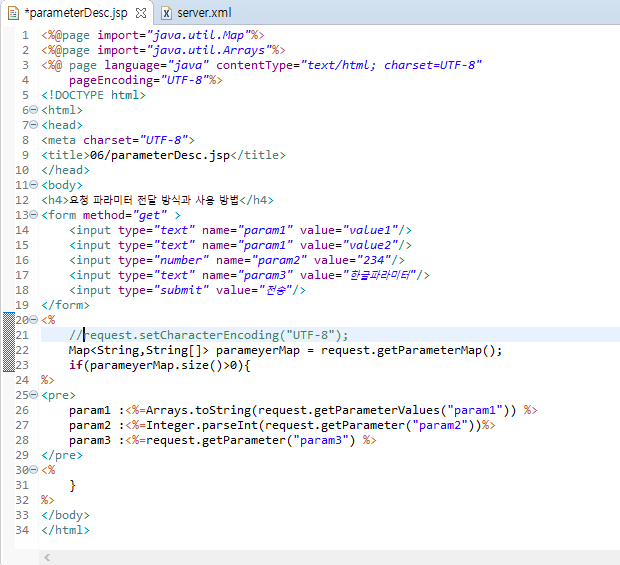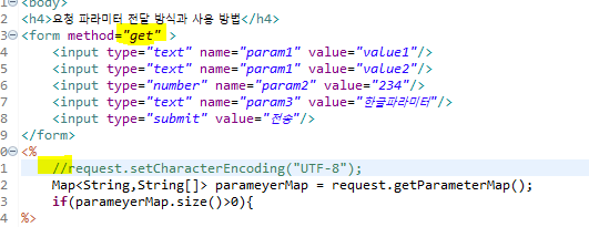 <%@page import="java.util.Map"%> <%@page import="java.util.Arrays"%> <%@ page language="java" contentType="text/html; charset=UTF-8" pageEncoding="UTF-8"%> <!DOCTYPE html> <html> <head> <meta charset="UTF-8"> <title>06/parameterDesc.jsp</title> </head> <body> <h4>요청 파라미터 전달 방식과 사용 방법</h4> <form method="post" > <input type="text" name="param1" value="value1"/> <input type="text" name="param1" value="value2"/> <input type="number" name="param2" value="234"/> <input type="text" name="param3" value="한글파라미터"/> <input type="submit" value="전송"/> </form> <% request.setCharacterEncoding("UTF-8"); Map<String,String[]> parameyerMap = request.getParameterMap(); if(parameyerMap.size()>0){ %> <pre> param1 :<%=Arrays.toString(request.getParameterValues("param1")) %> param2 :<%=Integer.parseInt(request.getParameter("param2"))%> param3 :<%=request.getParameter("param3") %> </pre> <% } %> </body> </html>