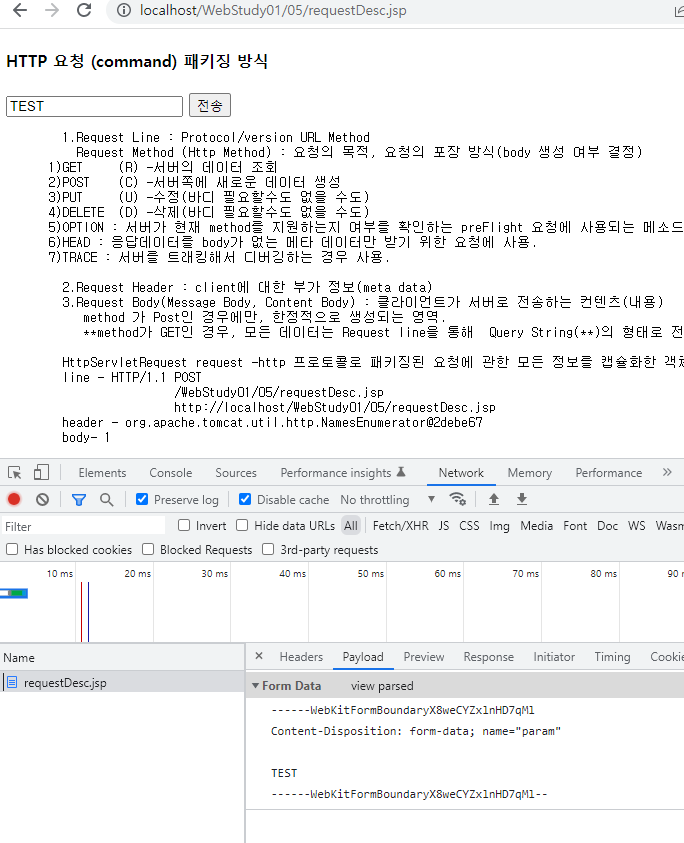 <%@ page language="java" contentType="text/html; charset=UTF-8" pageEncoding="UTF-8"%> <!DOCTYPE html> <html> <head> <meta charset="UTF-8"> <title>05/requestDesc.jsp</title> </head> <body> <h4>HTTP 요청 (command) 패키징 방식</h4> <form method="post" enctype="multipart/form-data"> <!--<input type="hidden" name="_method" value="PUT"> --> <input type="text" name="param" value="TEST"> <input type="submit" value="전송"> </form> <pre> 1.Request Line : Protocol/version URL Method Request Method (Http Method) : 요청의 목적, 요청의 포장 방식(body 생성 여부 결정) 1)GET (R) -서버의 데이터 조회 2)POST (C) -서버쪽에 새로운 데이터 생성 3)PUT (U) -수정(바디 필요할수도 없을 수도) 4)DELETE (D) -삭제(바디 필요할수도 없을 수도) 5)OPTION : 서버가 현재 method를 지원하는지 여부를 확인하는 preFlight 요청에 사용되는 메소드. 6)HEAD : 응답데이터를 body가 없는 메타 데이터만 받기 위한 요청에 사용. 7)TRACE : 서버를 트래킹해서 디버깅하는 경우 사용. 2.Request Header : client에 대한 부가 정보(meta data) 3.Request Body(Message Body, Content Body) : 클라이언트가 서버로 전송하는 컨텐츠(내용) method 가 Post인 경우에만, 한정적으로 생성되는 영역. **method가 GET인 경우, 모든 데이터는 Request line을 통해 Query String(**)의 형태로 전송됨 HttpServletRequest request -http 프로토콜로 패키징된 요청에 관한 모든 정보를 캡슐화한 객체; line - <%=request.getProtocol() %> <%=request.getMethod() %> <%=request.getRequestURI() %> <%=request.getRequestURL() %> header - <%=request.getHeaderNames() %> 파라미터 데이터??? <%=request.getParameter("param") %> 파트 데이터 ??? <%=request.getPart("param") %> body- <%=request.getInputStream().available()%> 클라이언트가 입력한 데이터가 파라미터 형태로 전달되는 경우, -> getParameter 계열의 메소드를 사용함. 클라이언트가 입력한 데이터가 파트의 형태로 전달되는 경우, -> getPart 계열 메소드 사용 </pre> </body> </html>