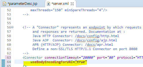 왜? 아까 처리해준거 때문에 => useBodyEncodingForURI="true" (라인에 있는 특수문자를 해석하는것이 나중에 해석이 되기에 get이어도 body에 설정이 적용되는원리)