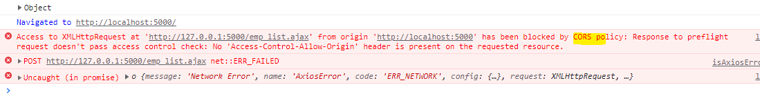 from flask_cors.extension import CORS app = Flask(__name__,static_url_path='') CORS(app)이렇게 써주기