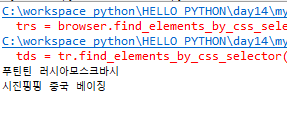 from selenium import webdriver from selenium.webdriver.common.by import By # Webdriver 실행 browser = webdriver.Chrome() browser.get('http://127.0.0.1:5000/') trs = browser.find_elements(by=By.CSS_SELECTOR, value = "#tb > tr") for tr in trs : tds = tr.find_elements(by=By.CSS_SELECTOR, value = "td") print(tds[1].text, tds[3].text)=>하지만 이런식으로 쓰는것이 좋음
