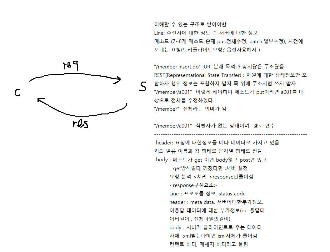 **Status Code : 요청 처리 성공/ 실패에 대한 상태 코드 1)100 :ing...Websocket, WebRTC(구글meet, real time process 사용됨. 실시간 양방향) 2)200 :OK 3)300 :요청이 처리되기 위해서는 클라이언트의 추가 액션이 필요함. 304 :NotModified : cache 연관, 클라이언트가 캐싱한 데이터가 서버에서 변경된 적이 없는 최신 데이터임. 302/307 :Moved :location(new address) 헤더와 함게 사용됨. -Redirect. 4)400 :fail(client side 요청이 잘못됐다.클라이언트가 비정상 코드를 넘기고있음) 401 :SC_UNAUTHORIZED(관리자 권한이 없는 사용자가 요청하는경우. 당신은 이권한 사용할 수 없다,권한오류) 403 :SC_FORBIDDEN(접근을 막는다. 접근제어 할때 사용,인트라넷에서 주로 사용,권한오류) 404 :NotFound(그런 리소스는 없다.URI표현할 수 있는 자원은 없다.url 오류) 405 :Method NOT Allowed : method callback 이 구현되지 않은 경우. 406 :SC_NOT_ACCEPTABLE:서비스 미디어 타입 5)500 :fail(server side), 500(Internal server error)두번째 요청때 첫번째 데이터에 활용됐던 캐시데이터를 다시 활용