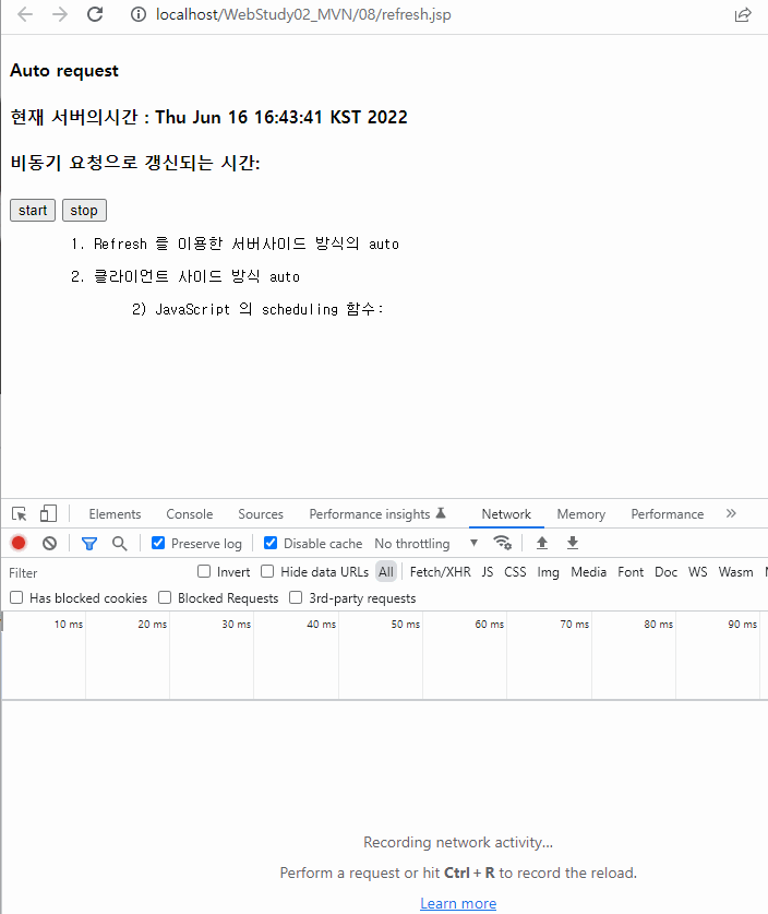 <%@page import="java.util.Date"%> <%@ page language="java" contentType="text/html; charset=UTF-8" pageEncoding="UTF-8"%> <!DOCTYPE html> <html> <head> <meta charset="UTF-8"> <meta http-equiv="Refresh" content="1"> // 1초마다 시간 바뀜 <meta http-equiv="Refresh" content="3;url=https://www.naver.com"> //3초뒤 네이버로 넘어감 <title>08/refresh.jsp</title> </head> <body> <h4> Auto request</h4> <h4> 현재 서버의시간 : <%= new Date() %></h4> <pre> 1. Refresh 를 이용한 서버사이드 방식의 auto <%-- response.setIntHeader("Refresh", 1); --%> 2. 클라이언트 사이드 방식 auto 1) HTML meta tag 2) JavaScript 의 scheduling 함수 </pre> </body> </html>=> 같은 방법임