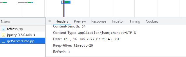 <script type="text/javascript"> // setTimeout(() => { // location.reload(); // }, 1000*3); let timeArea = $("#timeArea"); //나중에 빠르게 제공하기 위해서 // setInterval((function(){ $.ajax({ url : "getServerTime.jsp", dataType : "json", success : function(resp, status, jqXHR) { timeArea.html(resp.time); }, error : function(jqXHR, status, error) { console.log(jqXHR); console.log(status); console.log(error); } }); // }, 1000); </script><%@page import="java.util.Date"%> <%@ page language="java" contentType="application/json; charset=UTF-8" pageEncoding="UTF-8"%> { "time" : "<%=new Date() %>" } <% response.setIntHeader("Refresh", 1); %>