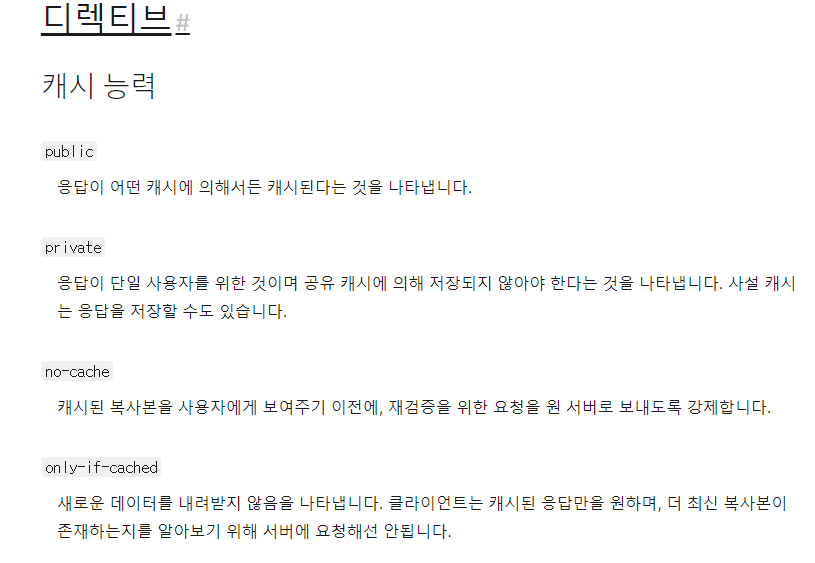 -Pragma (HTTP/1.0) -Cache-Control(HTTP/1.1) : 캐시제어 여부, 캐시 데이터의 속성들을 표현하는 지시자.(public,private(비공개),max-age=seconds(언제까지 저장)) -Expires : 캐시 만료 시점 설정.