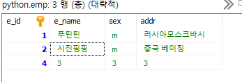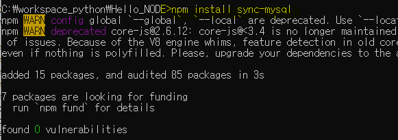 var mysql = require('mysql'); var connection = mysql.createConnection({ host : 'localhost', user : 'root', password : 'python', database : 'python', port:3305 }); connection.connect(); var sql="delete from emp where e_id='3'" ; connection.query(sql, function (error, results, fields) { console.log("error:", error); console.log("=================================="); console.log("results:", results); console.log("=================================="); console.log("fields:", fields); }); connection.end();다른방법