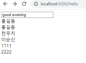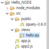 var bodyParser = require('body-parser'); var express = require('express'); var app = express(); app.use(bodyParser.json()); app.use(bodyParser.urlencoded({ extended : false })); app.set('view engine','ejs'); // 1 app.use(express.static(__dirname + '/public')); app.get('/', function (req, res) { res.send('Hello World!'); }); app.get('/hello', function (req, res) { var a="홍길동"; var b=["홍길동","전우치","이순신"]; var c=[ {"e_id":'1',"e_name":'1',"sex":'1',"addr":'1'}, {"e_id":'2',"e_name":'2',"sex":'2',"addr":'2'} ]; res.render('hello',{a:a,b:b,c:c}); }); app.get('/para', function (req, res) { var a = req.param('a'); res.send('para:' + a); }); app.post('/post', function (req, res) { var body = req.body; var a = body.a; res.send('post:'+a); }); app.listen(5000, function () { console.log('Listening on port 5000!'); });<html> <head> <title>title</title> </head> <body> <%=a %><br> <%for(var i=0; i< b.length; i++){%> <%=b[i]%></br> <%}%> <%for(var i=0; i< c.length; i++){%> <%=c[i].e_id%><%=c[i].e_name%><%=c[i].sex%><%=c[i].addr%></br> <%}%> </body> </html>