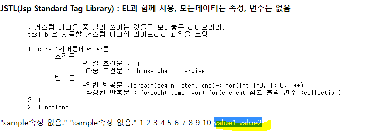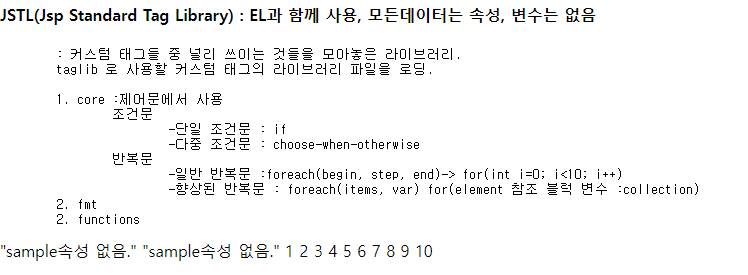 <c:if test="${empty sample }"> "sample속성 없음." </c:if> <c:if test="${not empty sample }"> "sample 속성 있음." </c:if> <c:choose> <c:when test="${empty sample }"> "sample속성 없음." </c:when> <c:otherwise> "sample 속성 있음." </c:otherwise> </c:choose> <c:forEach begin="1" step="1" end="10" var="i"> ${i } </c:forEach>i는 pageScope영역에 저장되어있음