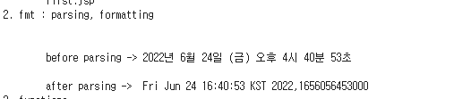 2. fmt : parsing, formatting <c:set var="today" value="<%=new Date() %>"/> <fmt:formatDate value="${today}" dateStyle="long" timeStyle="long" type="both" var="todayStr"/> before parsing -> ${todayStr } <fmt:parseDate value ="${todayStr}" dateStyle="long" timeStyle="long" type="both" var="today2"/> after parsing -> ${today2} ,${today2.time}type="both" => time이랑 date이랑 같이 보내주겠다 .