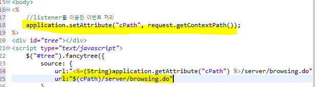 package kr.or.ddit.listener; import javax.servlet.ServletContext; import javax.servlet.ServletContextEvent; import javax.servlet.ServletContextListener; import javax.servlet.annotation.WebListener; @WebListener public class ContextLoaderListener implements ServletContextListener { public void contextInitialized(ServletContextEvent sce) { ServletContext application =sce.getServletContext(); application.setAttribute("cPath", application.getContextPath()); System.out.printf("%s 로딩완료\n", application.getContextPath()); } public void contextDestroyed(ServletContextEvent sce) { ServletContext application =sce.getServletContext(); System.out.printf("%s 언로드\n", application.getContextPath()); } }=> 실행할때 얘가 이미 cPath를 set해주고 있으므로 browsing.jsp에서 <%set..%>해줄필요 없다.