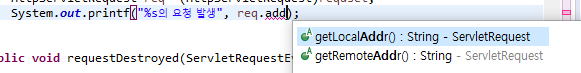 package kr.or.ddit.listener; import javax.servlet.ServletRequest; import javax.servlet.ServletRequestEvent; import javax.servlet.ServletRequestListener; import javax.servlet.annotation.WebListener; import javax.servlet.http.HttpServletRequest; @WebListener public class CustomRequestLifecycleListener implements ServletRequestListener { public static final String STARATTR =" CustomRequestLifecycleListener.start"; public void requestInitialized(ServletRequestEvent sre) { ServletRequest requset =sre.getServletRequest(); HttpServletRequest req =(HttpServletRequest)requset; System.out.printf("%s의 요청 발생\n", req.getRemoteAddr()); long start =System.currentTimeMillis(); req.setAttribute(STARATTR, new Long(start)); // 오토박싱 기본생성자 래퍼.. 대문자 L로 들어감 기본형으로들어감 } public void requestDestroyed(ServletRequestEvent sre) { ServletRequest requset =sre.getServletRequest(); HttpServletRequest req =(HttpServletRequest)requset; long end =System.currentTimeMillis(); long start =((Long)req.getAttribute(STARATTR)).longValue(); //다시 기본형으로 언박싱 System.out.printf("소요시간 : %d\n",(end-start)); } }request라는 scope에 넣자