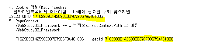 4. Cookie객체(Map) :cookie클라이언트쪽에서 꺼내야함 : 나에게 필요한 쿠키 찾으려면 <% Cookie[] cookies =request.getCookies(); Cookie finded =null; if(cookies!=null){ for(Cookie tmp:cookies){ if("JSESSIONID".equals(tmp.getName())){ //쿠키 찾았다! finded =tmp; break; } } } out.print("JSESSIONID :"+finded.getValue()); %>