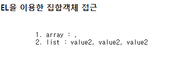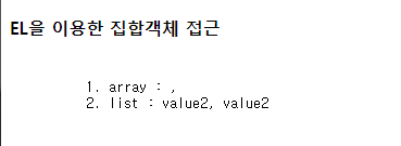 1. array : <%--<%=array[2] %>--%>, ${sampleArray[2]} 2. list : <%-- <%=list.get(2) %> --%>, <%-- ${sampleList.get(2) } --%>, ${sampleList[2] }