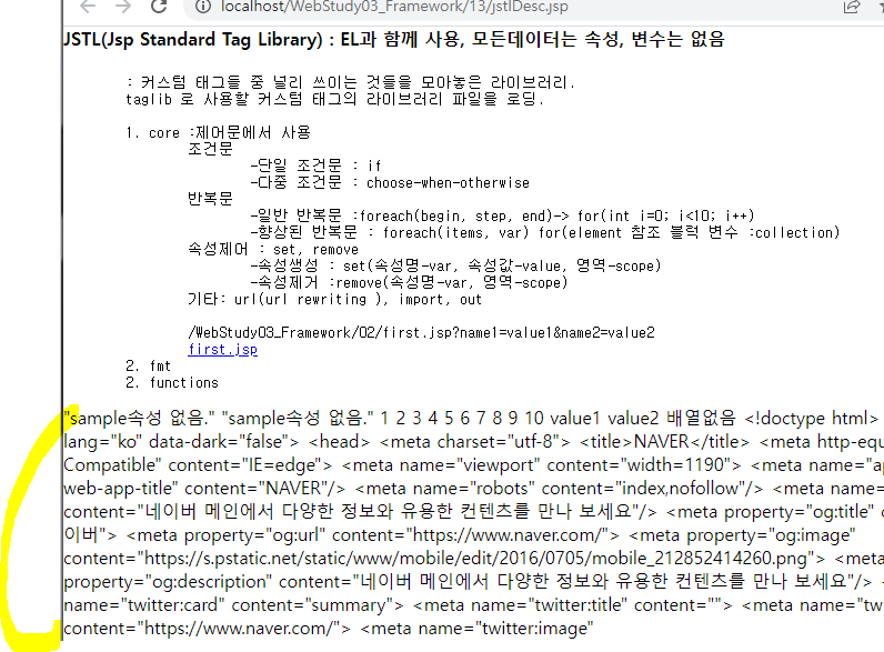 <c:import url="https://www.naver.com" var="naver"></c:import> <c:out value="${naver}" escapeXml="false"></c:out>=> escapeXml="false" : 소스 보기 하느냐 안하느냐에 따라 달라짐 true하면 코드 나옴 ..!!!!
