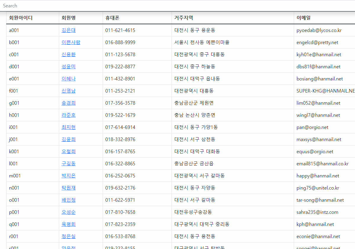 <%@ page language="java" contentType="text/html; charset=UTF-8" pageEncoding="UTF-8"%> <h4>회원상세 조회페이지</h4> <table border="1"> <thead> <tr> <th>회원아이디</th> <th>회원명</th> <th>휴대폰</th> <th>거주지역</th> <th>이메일</th> <th>마일리지</th> </tr> </thead> <tbody> <tr> <td> ${member.memId} </td> <td> ${member.memName} </td> <td> ${member.memHp} </td> <td> ${member.memAdd1} </td> <td> ${member.memMail} </td> <td> ${member.memMileage} </td> </tr> </tbody> </table>