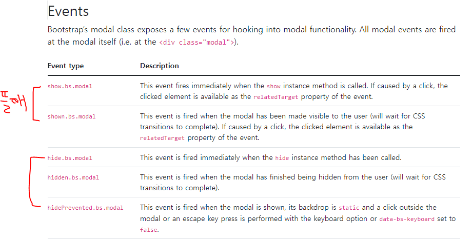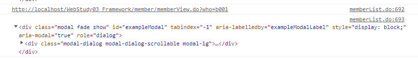 즉, event.target은 부모로부터 이벤트가 위임되어 발생하는 자식의 위치, 내가 클릭한 자식 요소를 반환한다. 하지만 currentTarget은 이벤트가 부착된 부모의 위치를 반환한다.<%@page import="java.util.Locale"%> <%@page import="kr.or.ddit.vo.MemberVO"%> <%@page import="java.util.List"%> <%@page language="java" contentType="text/html; charset=UTF-8" pageEncoding="UTF-8"%> <%@taglib uri="http://java.sun.com/jsp/jstl/core" prefix="c" %> <%@taglib uri="http://java.sun.com/jsp/jstl/fmt" prefix="fmt" %> <table class="table table-bordered"> <thead> <tr> <th>회원아이디</th> <th>회원명</th> <th>휴대폰</th> <th>거주지역</th> <th>이메일</th> <th>마일리지</th> </tr> </thead> <tbody> <c:choose> <c:when test="${not empty memberList }"> <c:forEach items="${memberList }" var="member"> <tr> <td>${member['memId'] }</td> <c:url value="/member/memberView.do" var="viewURL"> <c:param name="who" value="${member['memId'] }"></c:param> </c:url> <!-- TDD, EDD --> <td><a href="${viewURL}" data-bs-toggle="modal" data-bs-target="#exampleModal"> ${member['memName'] }</a></td> <td>${member['memHp'] }</td> <td>${member.memAdd1 }</td> <td>${member.memMail }</td> <td> <fmt:setLocale value="<%=Locale.US %>"/> <fmt:formatNumber value="${member.memMileage }" type="currency" /> </td> </tr> </c:forEach> </c:when> <c:otherwise> <tr> <td colspan="6">회원이 아직 없음.</td> </tr> </c:otherwise> </c:choose> </tbody> </table> <!-- Modal --> <div class="modal fade" id="exampleModal" tabindex="-1" aria-labelledby="exampleModalLabel" aria-hidden="true"> <div class="modal-dialog modal-dialog-scrollable modal-lg" > <div class="modal-content"> <div class="modal-header"> <h5 class="modal-title" id="exampleModalLabel">회원 상세 정보</h5> <button type="button" class="btn-close" data-bs-dismiss="modal" aria-label="Close"></button> </div> <div class="modal-body"> ... </div> <div class="modal-footer"> <button type="button" class="btn btn-secondary" data-bs-dismiss="modal">Close</button> <button type="button" class="btn btn-primary">Save changes</button> </div> </div> </div> </div> <script> let exampleModal = $('#exampleModal').on('show.bs.modal', function(event){ // console.log(event.relatedTarget.href) console.log(event.currentTarget); let url = event.relatedTarget.href; $.ajax({ url : url, dataType : "html", success : function(resp, status, jqXHR) { exampleModal.find(".modal-body").html(resp) }, error : function(jqXHR, status, error) { console.log(jqXHR); console.log(status); console.log(error); } }); }).on("hidden.bs.modal", function(){ console.log(event.target); //이벤트가 발생한 요소를 반환해준다. 즉 모달에 쓰인 div이런거 다 가져오더라 $(event.target).find(".modal-body").empty(); }); </script><console.log(event.target); //이벤트가 발생한 요소를 반환해준다. >