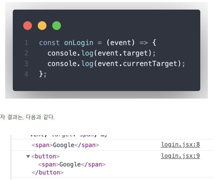 event.target은 자식 요소인 span을 리턴하고, event.currentTarget은 부모 요소인 button을 반환하는 것을 알 수 있다.