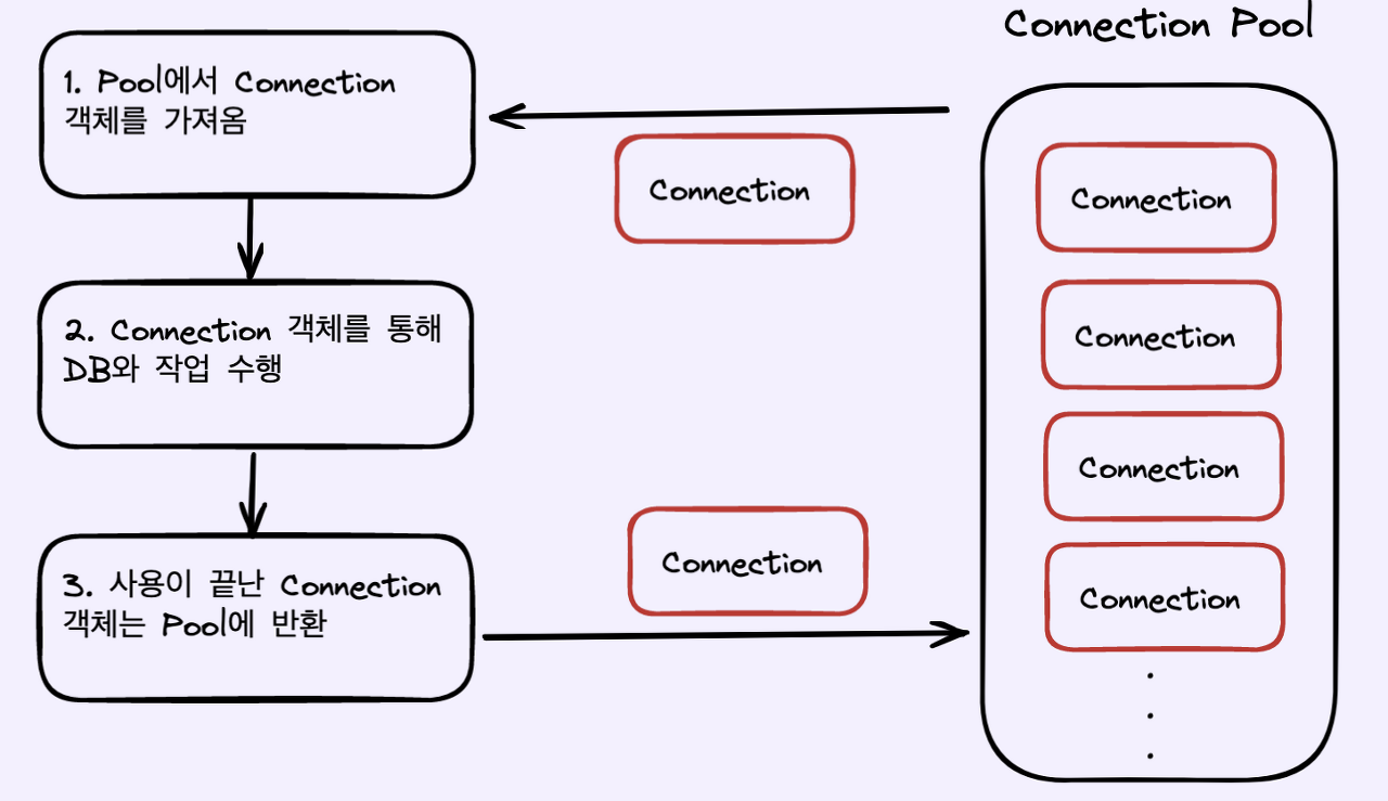 그리고 DB 연결 요청이 있으면, 이 Pool 이라는 공간에서 Connection 객체를 가져다 쓰고 반환 하게 됩니다.