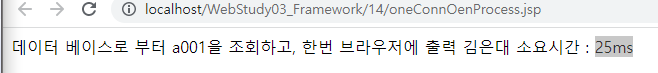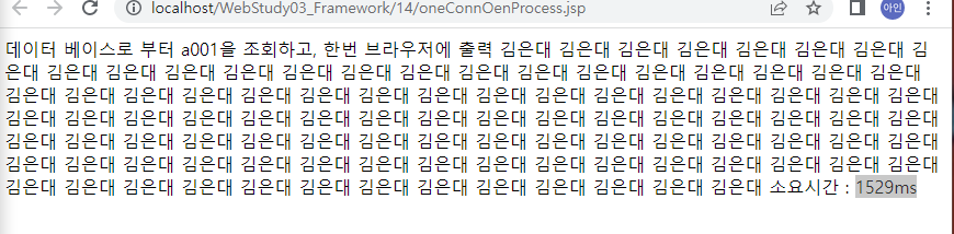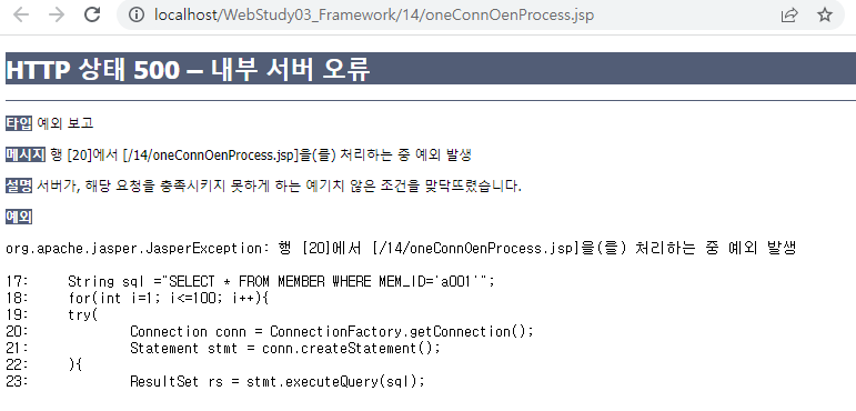 <%@page import="java.sql.ResultSet"%> <%@page import="java.sql.Statement"%> <%@page import="kr.or.ddit.db.ConnectionFactory"%> <%@page import="java.sql.Connection"%> <%@ page language="java" contentType="text/html; charset=UTF-8" pageEncoding="UTF-8"%> <!DOCTYPE html> <html> <head> <meta charset="UTF-8"> <title>Insert title here</title> </head> <body> 데이터베이스로부터 a001을 조회하고, 한번 브라우저에 출력. <% long start = System.currentTimeMillis(); String sql = "SELECT * FROM MEMBER WHERE MEM_ID = 'a001'"; String memName = null; for(int i=1; i<=100; i++){ try( Connection conn = ConnectionFactory.getConnection(); Statement stmt = conn.createStatement(); ){ ResultSet rs = stmt.executeQuery(sql); if(rs.next()&&memName==null){ memName = rs.getString("MEM_NAME"); } } } out.println(memName); long end = System.currentTimeMillis(); %> 소요시간 : <%=end-start %>ms </body> </html>연결은 100번 출력은 한번, 새로고침 여러번하면 꺼짐 .. -> 서버가 감당할 수 없을만큼 커넥션이 생성되고 있음