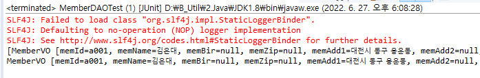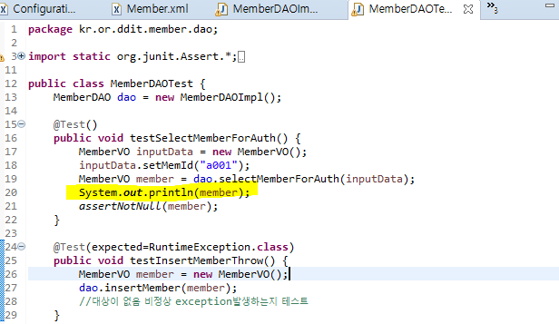 <?xml version="1.0" encoding="UTF-8"?> <!DOCTYPE mapper PUBLIC "-//mybatis.org//DTD Mapper 3.0//EN" "http://mybatis.org/dtd/mybatis-3-mapper.dtd"> <mapper namespace="kr.or.ddit.member.dao.MemberDAO"> <select id="selectMemberForAuth" parameterType="MemberVO" resultType="MemberVO"> SELECT MEM_ID, MEM_PASS, MEM_NAME, MEM_HP, MEM_ADD1 FROM MEMBER WHERE MEM_ID = #{memId} </select> </mapper>Junit Test해보자