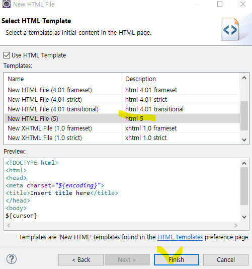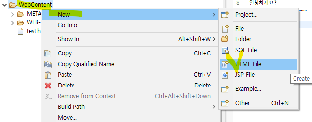 ->새로운 폴더가 만들어졌다면 그 폴더를 누르고 또 ctrl+n누르고 html검색해서 누른다음에 만들면 새로 만들어진다.
