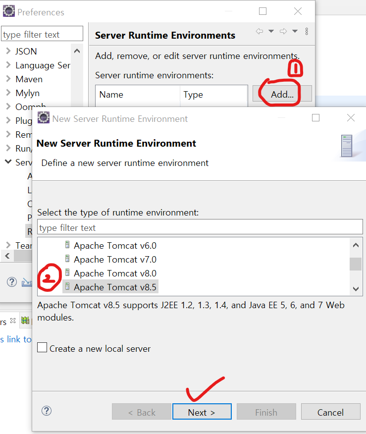 그런데 servers에 연결이 되어있어야 하므로 저부분을 두번 클릭하거나 Window>Preferences>Server>Runtime Environments에서 Apache Tomcat 8.5를 선택한다.