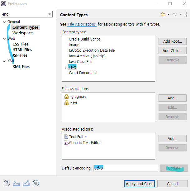 text누르고 그 밑에 써주고 update 해준다. 그리고 나머지도 다 utf-8로 설정해준다.