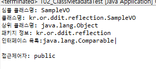 import java.lang.reflect.Modifier; /** * Class의 메타 데이터 가져오기 예제 */ public class T02_ClassMetadataTest { public static void main(String[] args) { //클래스 오브젝트 생성하기 (3번째 방법으로 하게됨) Class<?> clazz= SampleVO.class; System.out.println("심플 클래스명: "+clazz.getSimpleName()); System.out.println("클래스명: "+clazz.getName()); System.out.println("상위 클래스명: "+clazz.getSuperclass().getName()); //패키지 정보 가져오기 Package pkg=clazz.getPackage(); System.out.println("패키지 정보: "+pkg.getName()); //해당 클래스에서 구현하고 있는 인터페이스 목록 가져오기 Class<?>[] interfaces=clazz.getInterfaces(); System.out.print("인터페이스 목록:"); for(Class<?> inf: interfaces) { System.out.println(inf.getName()+"|"); } System.out.println(); //클래스의 접근 제어자 가져오기(flag bit 값 반환됨. =>접근제어자의 유무 체크함) int modFlag=clazz.getModifiers(); System.out.println("접근제어자: "+Modifier.toString(modFlag)); } }