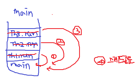 th1.run() 끝나면 main으로 가고 th1.run()지워지고 th2.run() 시작되어 끝나면 main으로 가고 이렇게 반복되어 마지막엔 실행이 종료된다.