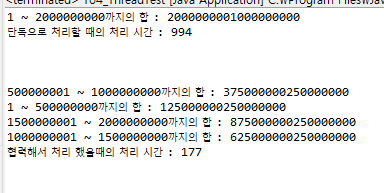 SumThread[] sumThs = new SumThread[] { new SumThread(1L, 500000000L), new SumThread( 500000001L, 1000000000L), new SumThread(1000000001L, 1500000000L), new SumThread(1500000001L, 2000000000L) }; startTime = System.currentTimeMillis(); for(int i=0; i<sumThs.length; i++) { sumThs[i].start(); } for(SumThread th : sumThs) { try { th.join(); } catch (InterruptedException e) { e.printStackTrace(); } } endTime = System.currentTimeMillis(); System.out.println("협력해서 처리 했을때의 처리 시간 : " + (endTime - startTime)); } }더해주는 Thread클래스