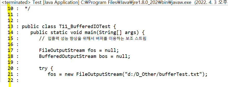 (바이트 기반의 Buffered 스트림 사용 예제)import java.io.BufferedOutputStream; import java.io.FileOutputStream; import java.io.IOException; public class T11_BufferedIOTest { public static void main(String[] args) { // 입출력 성능 향상을 위해서 버퍼를 이용하는 보조 스트림 FileOutputStream fos = null; BufferedOutputStream bos = null; //바이트 기반 try { fos = new FileOutputStream("d:/D_Other/bufferTest.txt"); // 버퍼의 크기를 지정하지 않으면 기본적으로 버퍼의 크기가 8192byte(8Kb)로 설정된다. // 버퍼의 크기가 5byte인 스트림 생성하기 bos = new BufferedOutputStream(fos,5); //BufferedOutputStream(fos)-8192byte for(int i = '1'; i<='9'; i++) { //숫자 자체를 문자로 지정하기 위해서 bos.write(i); //1~9인데 5byte이므로 2번만 작동 } bos.flush(); // 작업을 종료하기 전에 버퍼에 남아있는 데이터를 모두 출력시킨다. // (close시 자동으로 호출됨.) System.out.println("작업 끝..."); }catch(IOException e) { e.printStackTrace(); }finally { try { bos.close(); } catch (IOException e) { e.printStackTrace(); } } } }