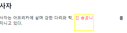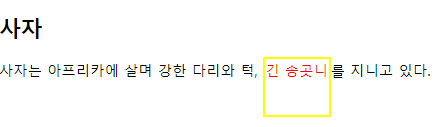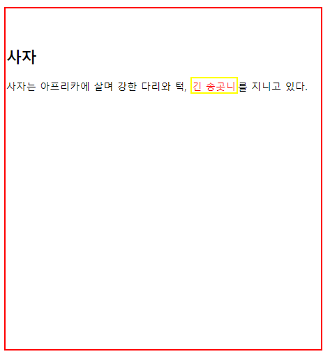 <!DOCTYPE html> <html> <head> <meta charset="UTF-8"> <title>Insert title here</title> </head> <style> div{ border:3px solid red; width: 500px; height: 500px; /*여백관련*/ padding-top: 40px; /*안쪽여백 border를 기준으로 안쪽 top이니까 위에부분을 말한다 왼쪽이면 왼쪽 */ margin-top:40px; /*바깥쪽 border를 기준으로 바깥쪽*/ } span{ border:3px solid yellow; color:red; width: 500px; height: 500px; /*여백관련 -inline level 에서 margin(바깥여백)은 좌우만 제어 가능 -padding은 상하 좌우 가능*/ padding-bottom:40px; margin-top:40px; } </style> <body> <div > <h2>사자</h2> <p> 사자는 아프리카에 살며 강한 다리와 턱, <span>긴 송곳니</span>를 지니고 있다. </p> </div> </body> </html>