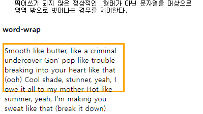 - break-word : 요소의 경계에서 break point가 아니어도 줄바꿈을 합니다.