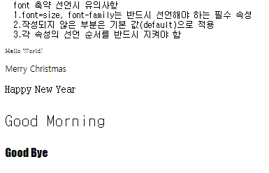 <style> #p1{ font-size: xx-small; font-family: serif; } #p2{ font-size: small; font-family: sans-serif; } #p3{ font-size: medium; font-family: cursive; } #p4{ font-size: xx-large; font-family: monospace; } #p5{ font-size: large; font-family: fantasy; } #p6{ } </style><body> <pre> font 축약 선언시 유의사항 1.font=size, font-family는 반드시 선언해야 하는 필수 속성 2.작성되지 않은 부분은 기본 값(default)으로 적용 3.각 속성의 선언 순서를 반드시 지켜야 함 </pre> <p id="p1">Hello World!</p> <p id="p2">Merry Christmas</p> <p id="p3">Happy New Year</p> <p id="p4">Good Morning</p> <p id="p5">Good Bye</p> <p id="p6"></p> </body>