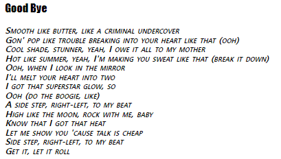 inherit- 부모 요소의 속성값을 상속받습니다.<p id="p6"> Smooth like butter, like a criminal undercover <br> Gon' pop like trouble breaking into your heart like that (ooh) <br> Cool shade, stunner, yeah, I owe it all to my mother <br> Hot like summer, yeah, I'm making you sweat like that (break it down)<br> Ooh, when I look in the mirror <br> I'll melt your heart into two <br> I got that superstar glow, so <br> Ooh (do the boogie, like) <br> A side step, right-left, to my beat <br> High like the moon, rock with me, baby <br> Know that I got that heat <br> Let me show you 'cause talk is cheap <br> Side step, right-left, to my beat <br> Get it, let it roll </p>